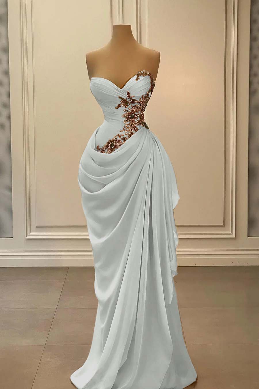 Dreamyannie Champange Prom Dress Strapless Sweetheart Satin Chiffon Sleeveless Formal Dress