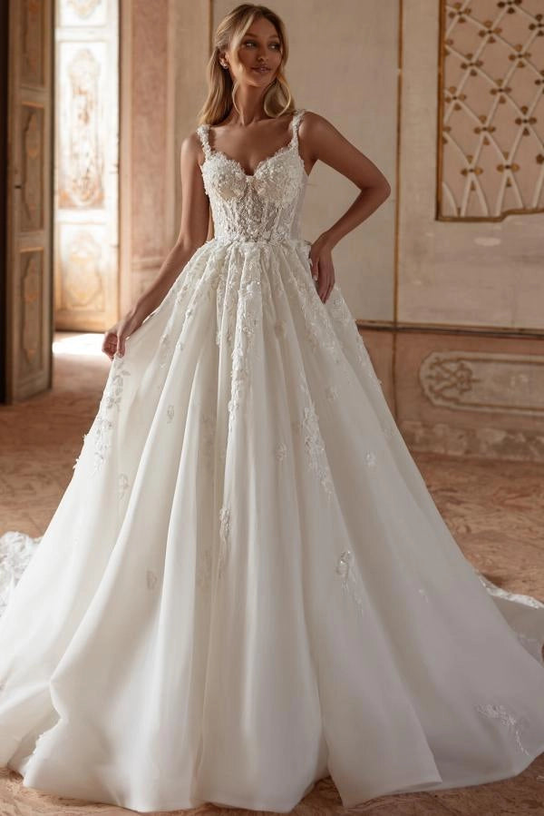 Ivory A Line Wedding Dress Princess Spaghetti Straps Lace Tulle Bridal Gown