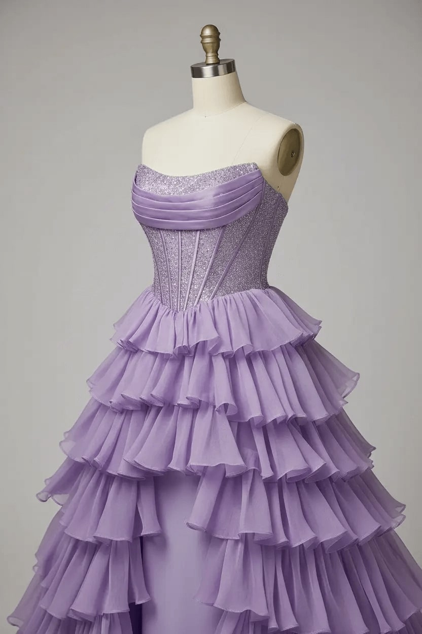 Make a stunning entrance in this ethereal lilac prom dress that combines timeless elegance with modern sophistication. This strapless A-line gown features luxurious chiffon fabric that flows gracefully with every movement, creating a dreamy silhouette perfect for your special night.