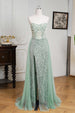 Mint Green Beaded Formal Dress Strapless Sheath Wedding Party Dress with Panel Train