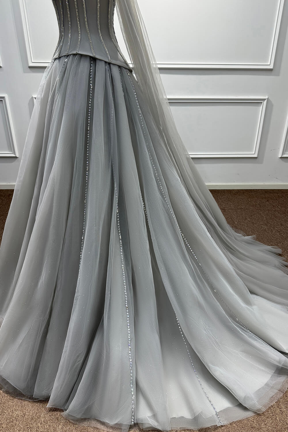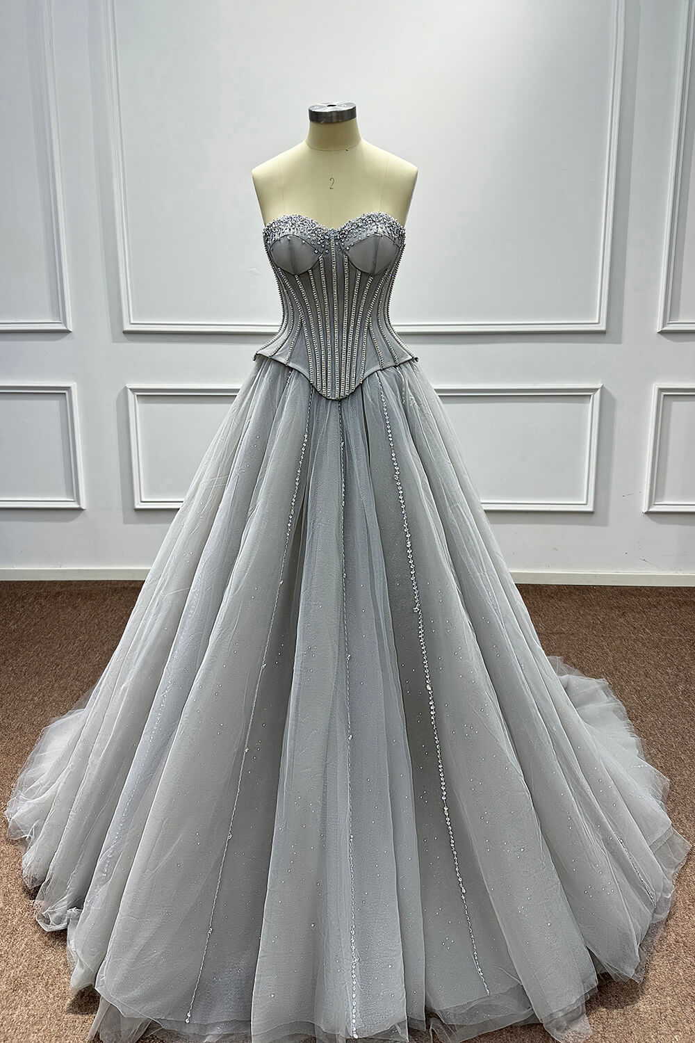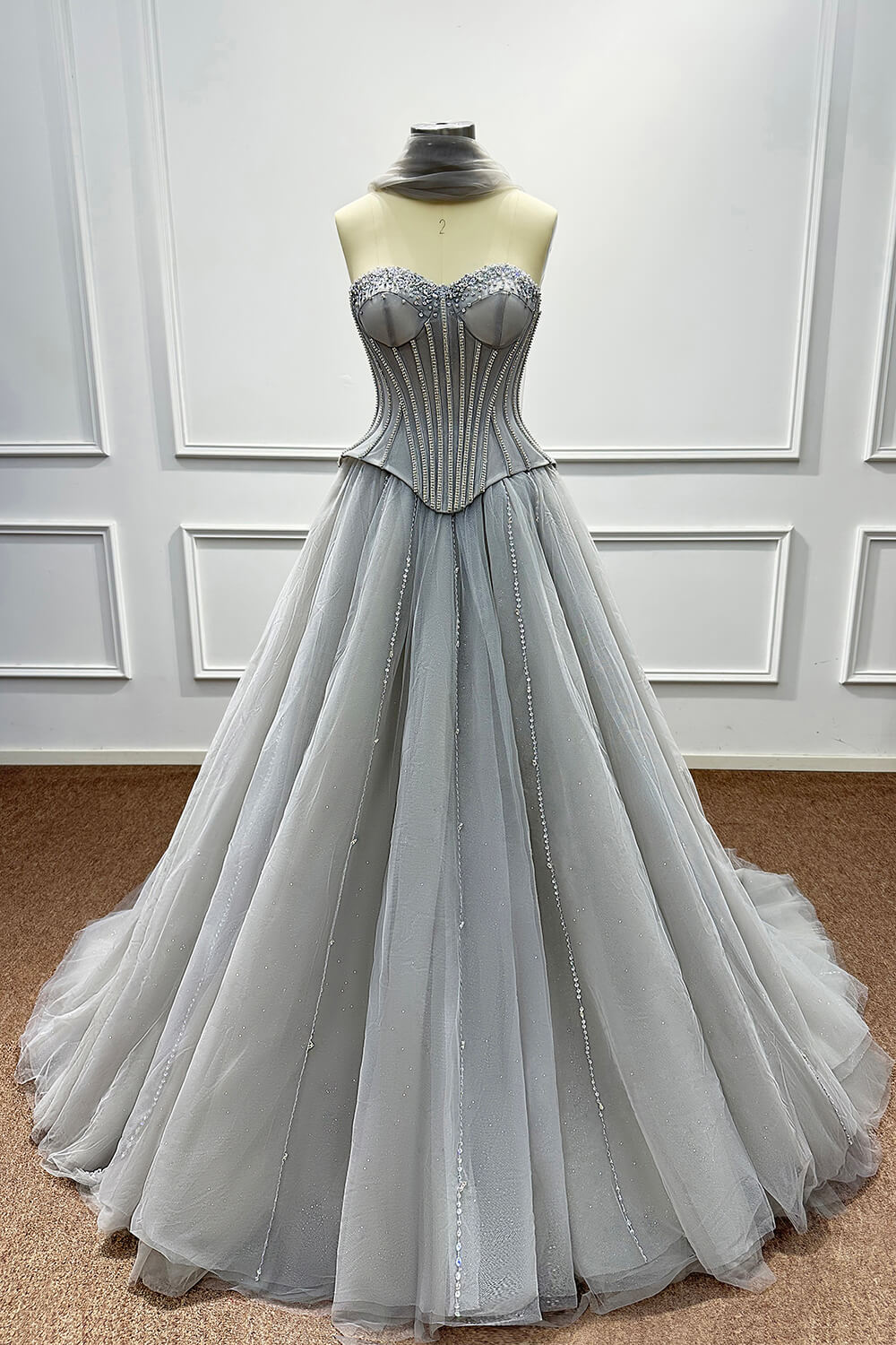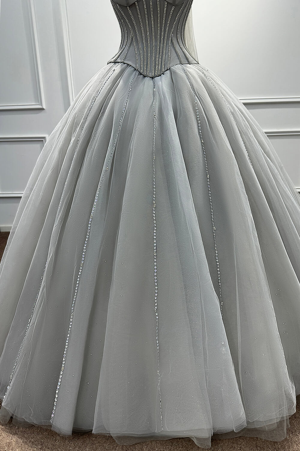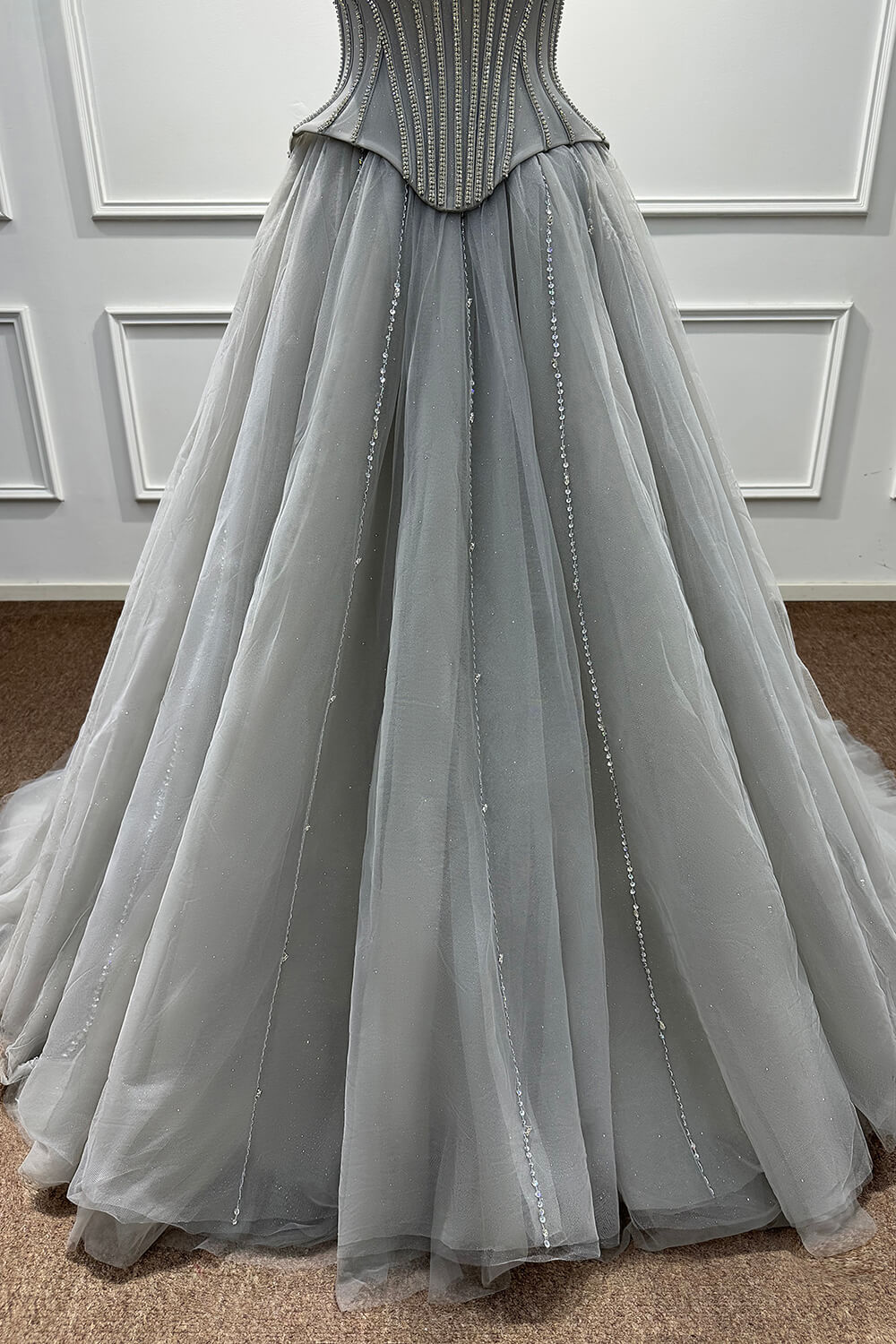 This dress combines timeless elegance with modern sophistication. The corset construction ensures a flattering fit that accentuates your figure, while the soft tulle skirt creates a dreamy, princess-worthy silhouette. The carefully placed beadings and rhinestones add just the right amount of sparkle without overwhelming the refined grey palette.