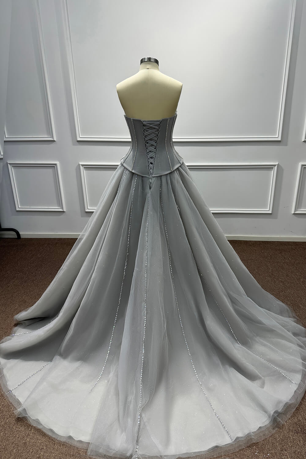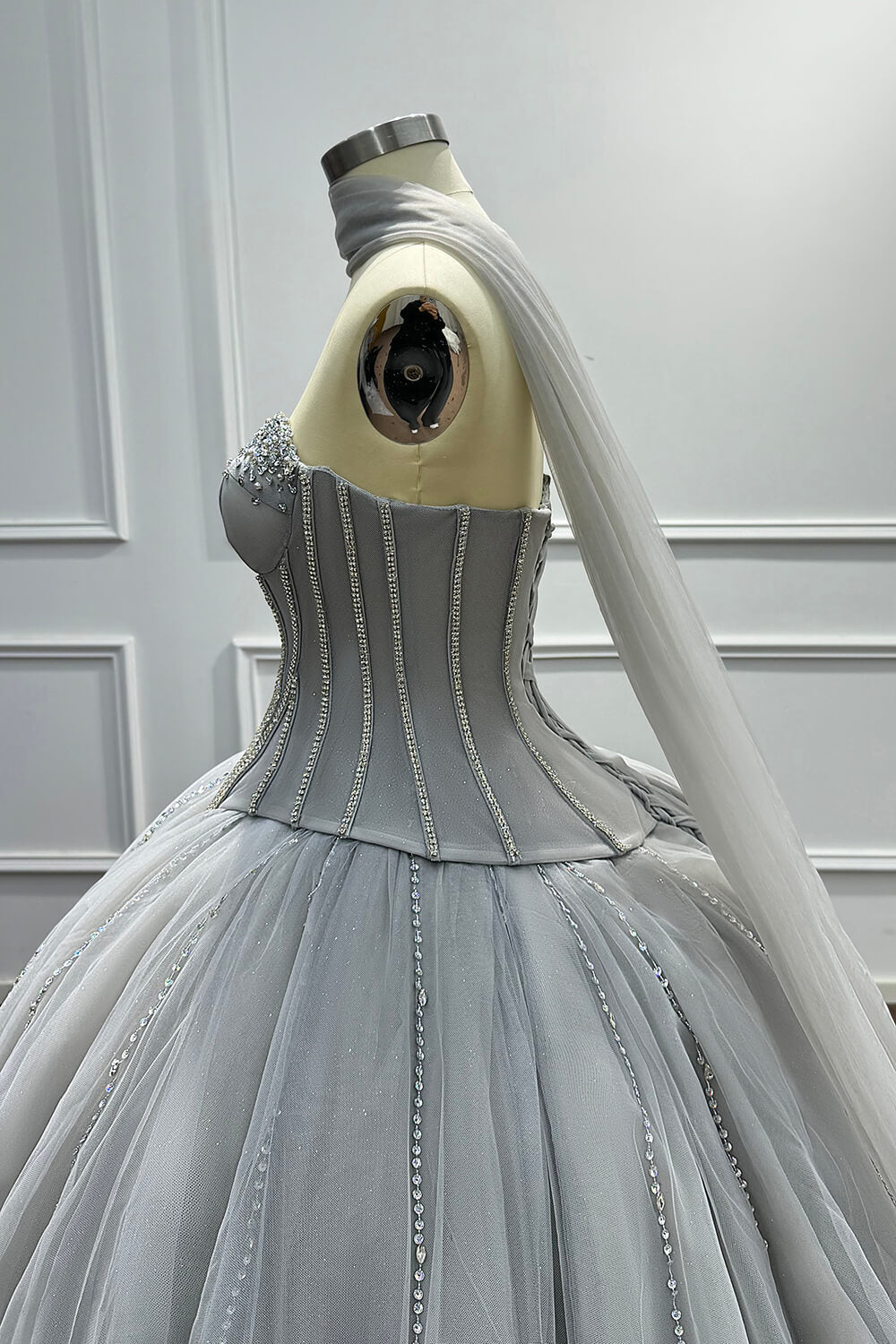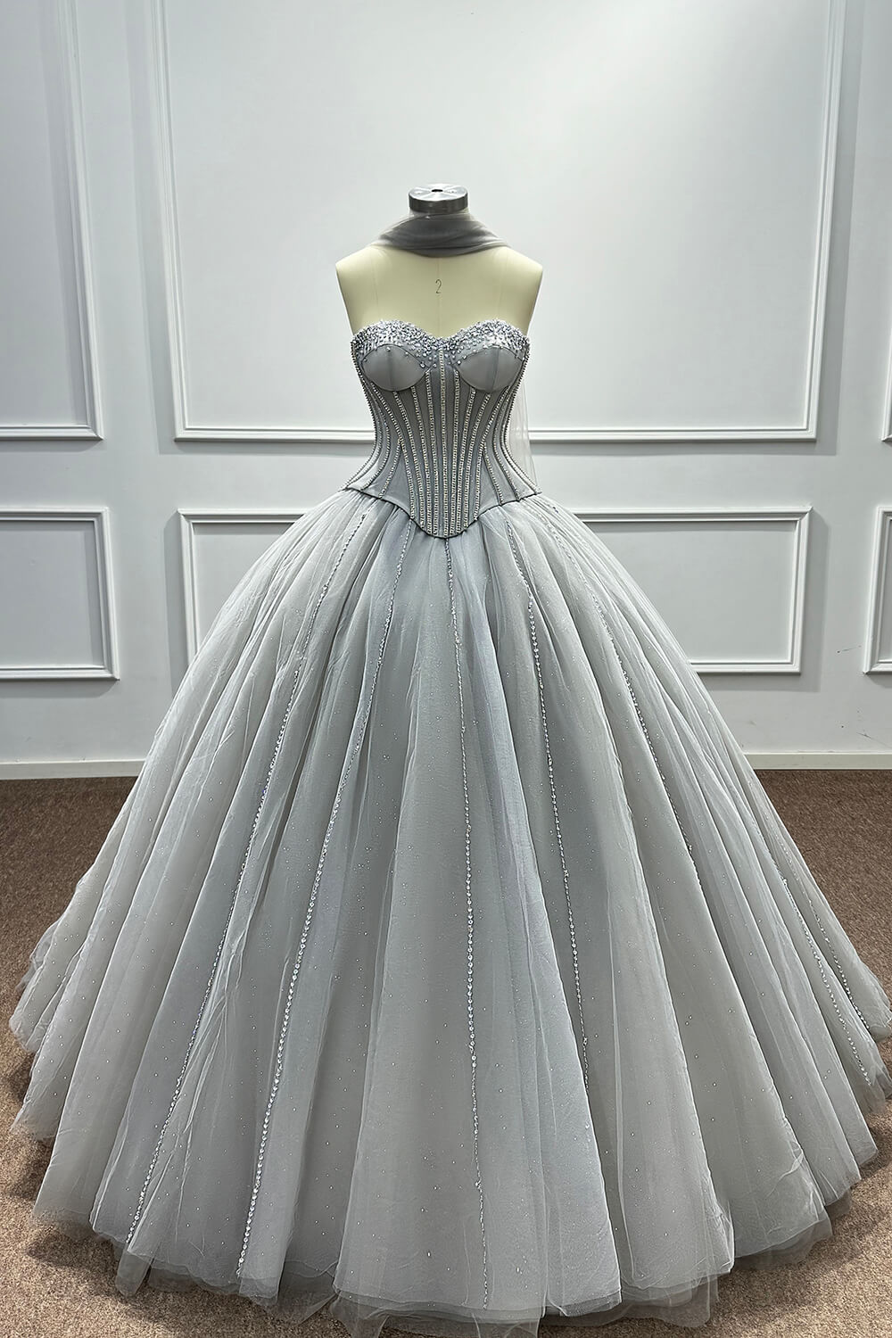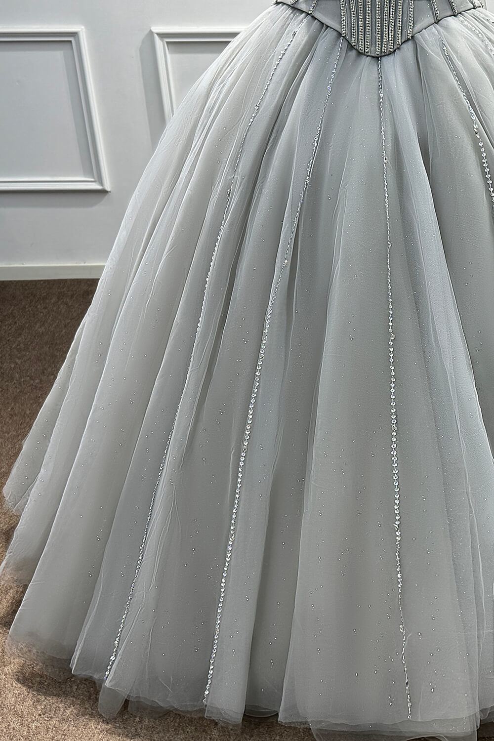 This dress combines timeless elegance with modern sophistication. The corset construction ensures a flattering fit that accentuates your figure, while the soft tulle skirt creates a dreamy, princess-worthy silhouette. The carefully placed beadings and rhinestones add just the right amount of sparkle without overwhelming the refined grey palette.