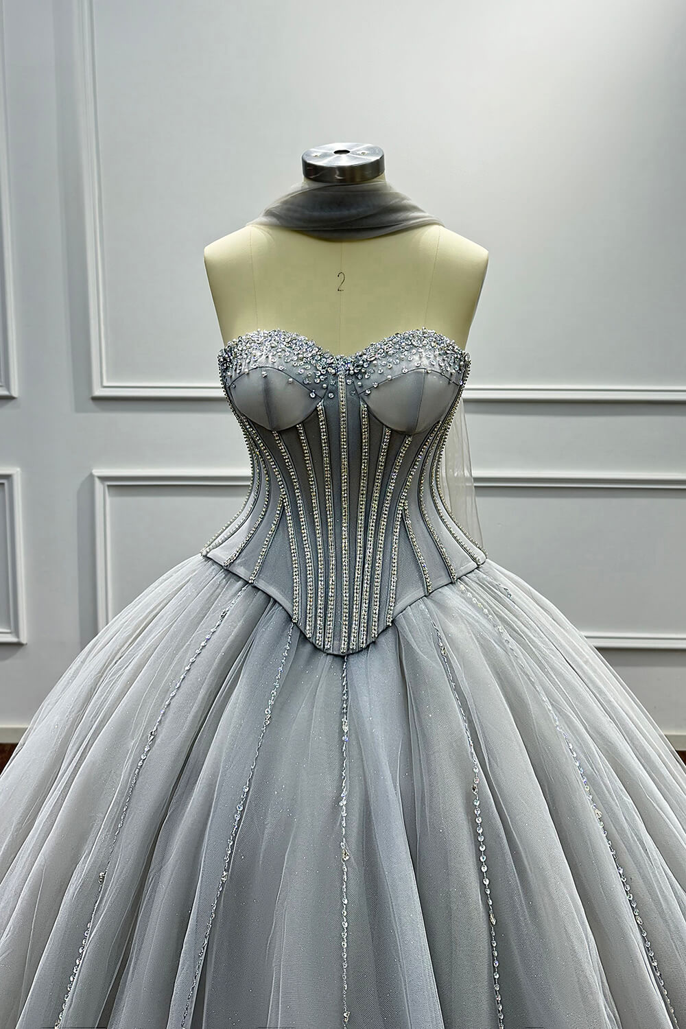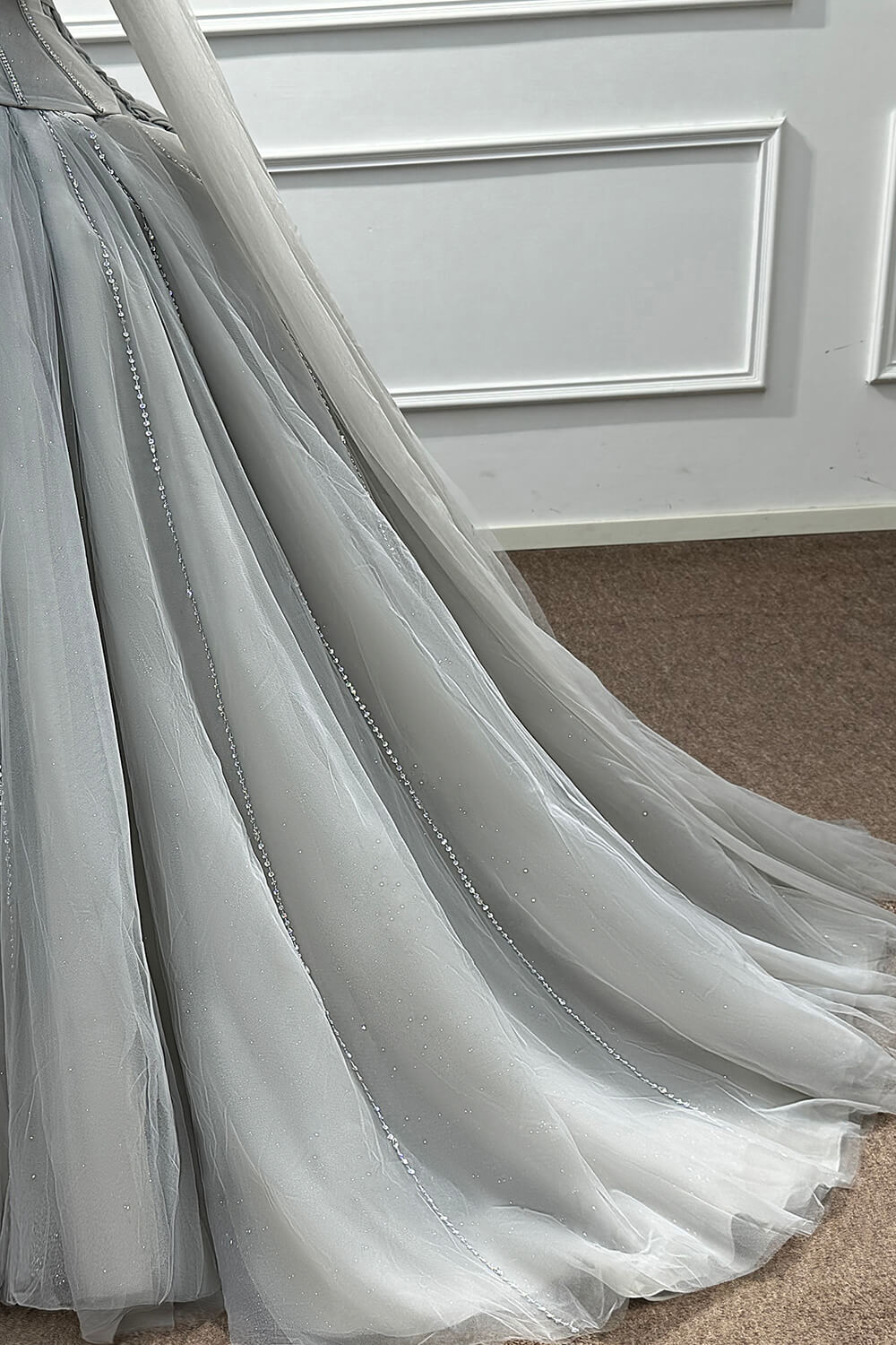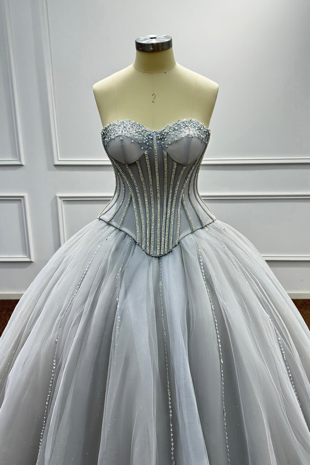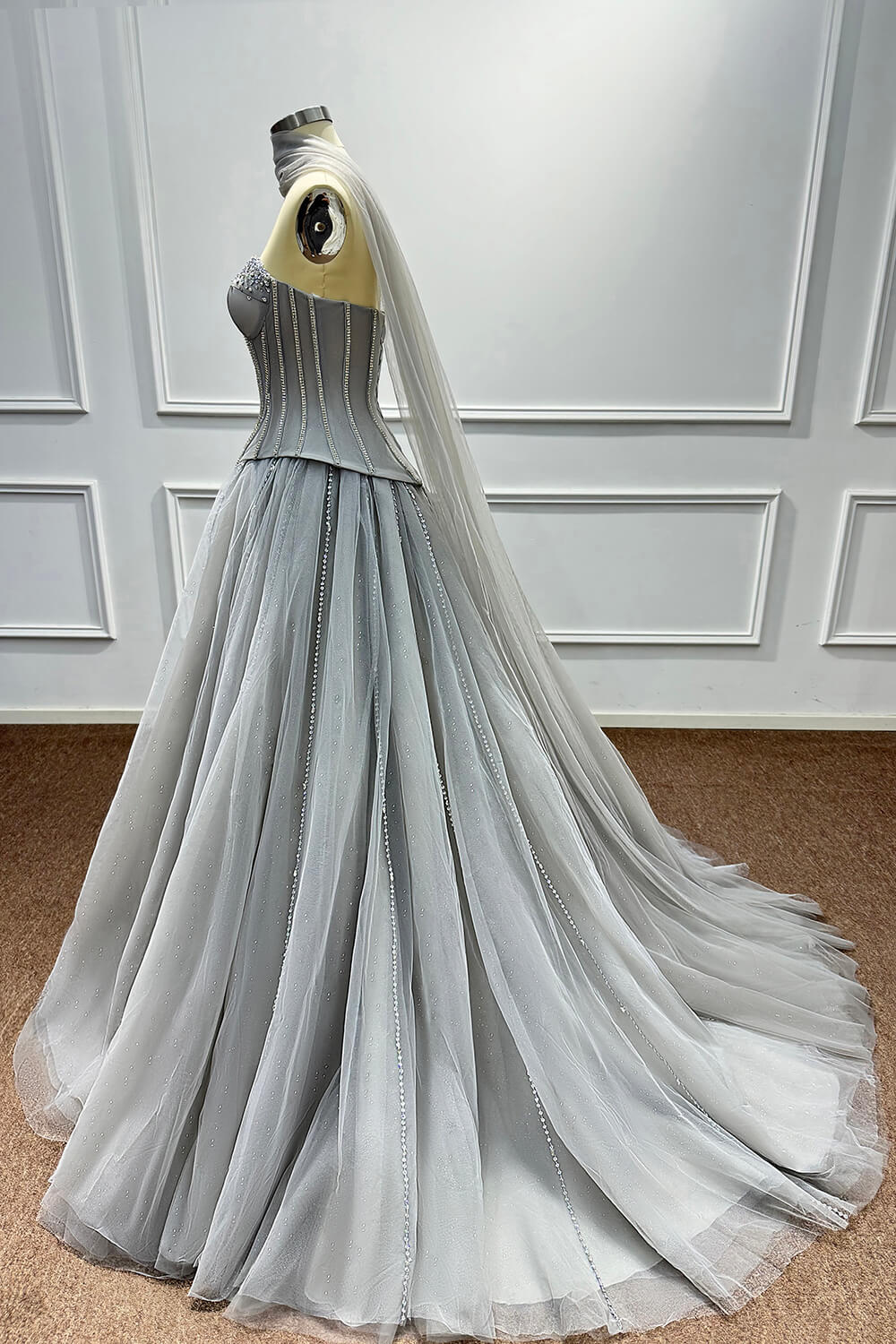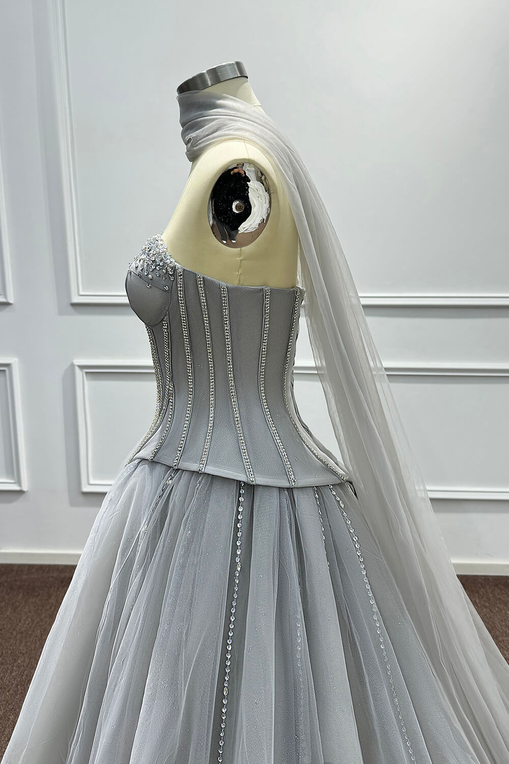 This dress combines timeless elegance with modern sophistication. The corset construction ensures a flattering fit that accentuates your figure, while the soft tulle skirt creates a dreamy, princess-worthy silhouette. The carefully placed beadings and rhinestones add just the right amount of sparkle without overwhelming the refined grey palette.