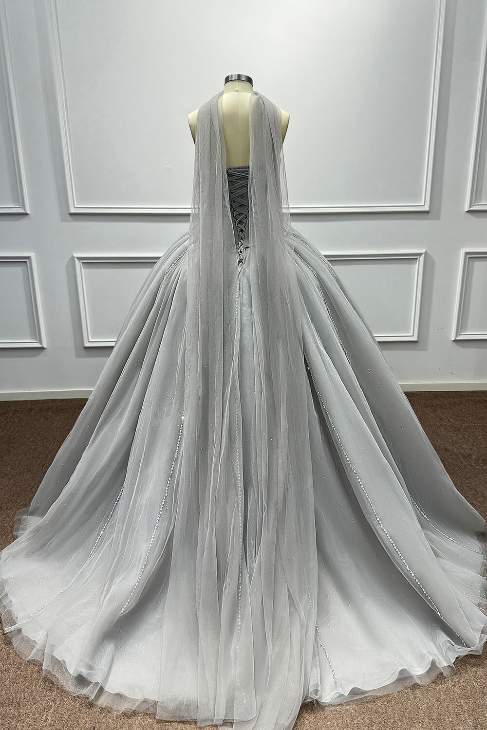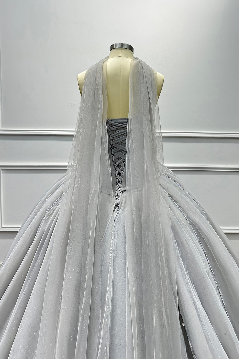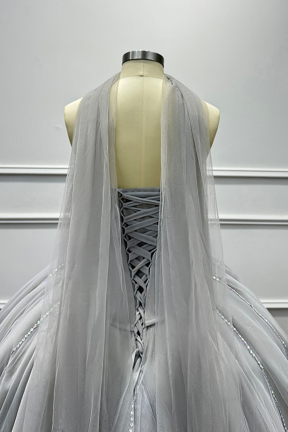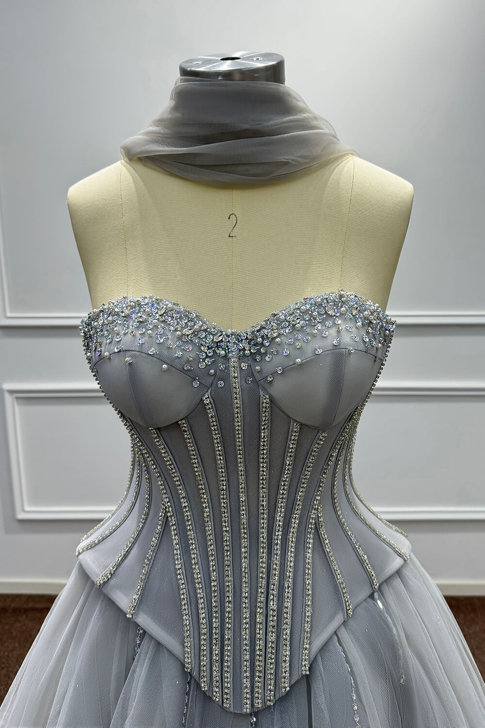 This dress combines timeless elegance with modern sophistication. The corset construction ensures a flattering fit that accentuates your figure, while the soft tulle skirt creates a dreamy, princess-worthy silhouette. The carefully placed beadings and rhinestones add just the right amount of sparkle without overwhelming the refined grey palette.