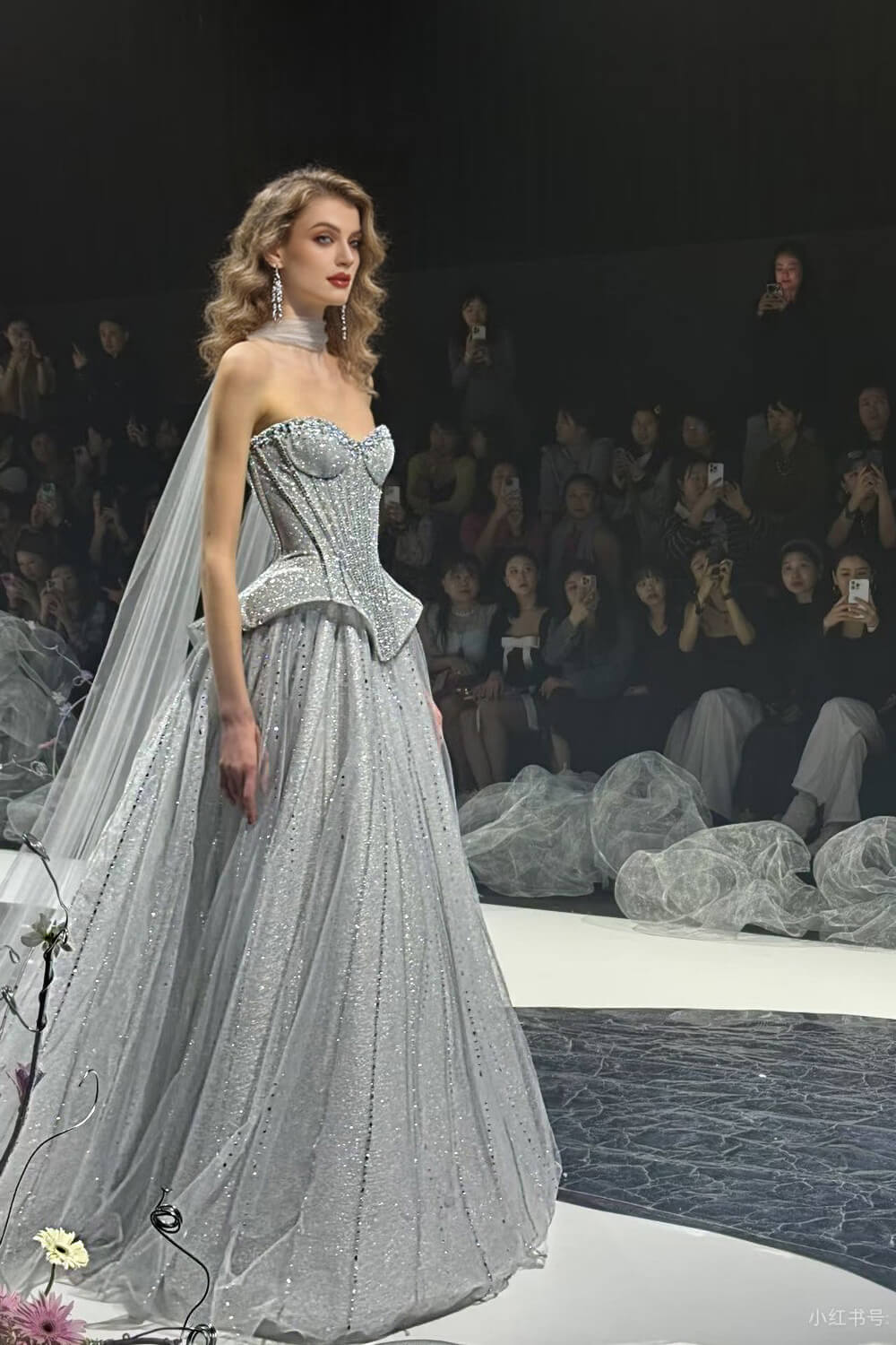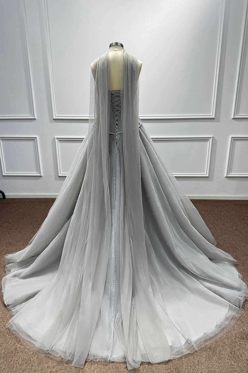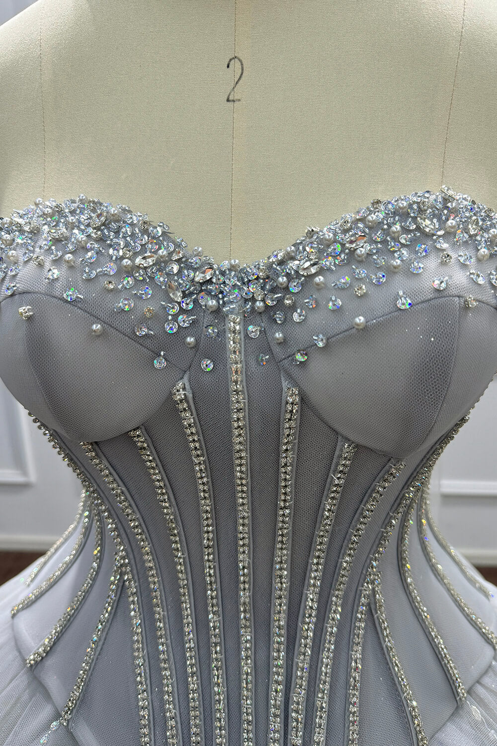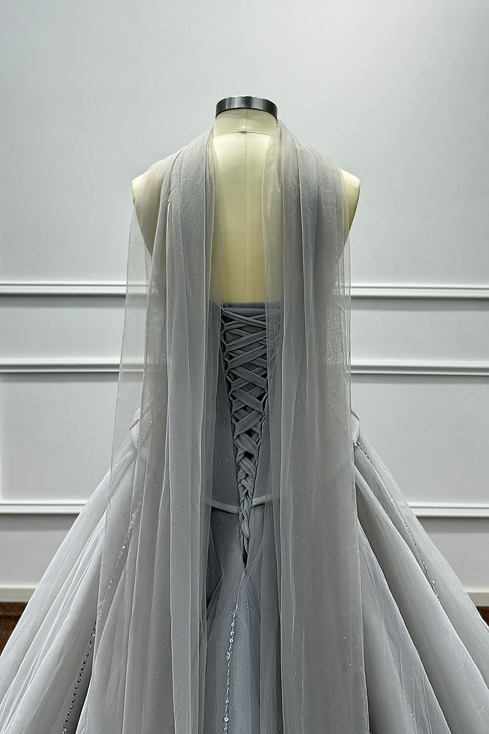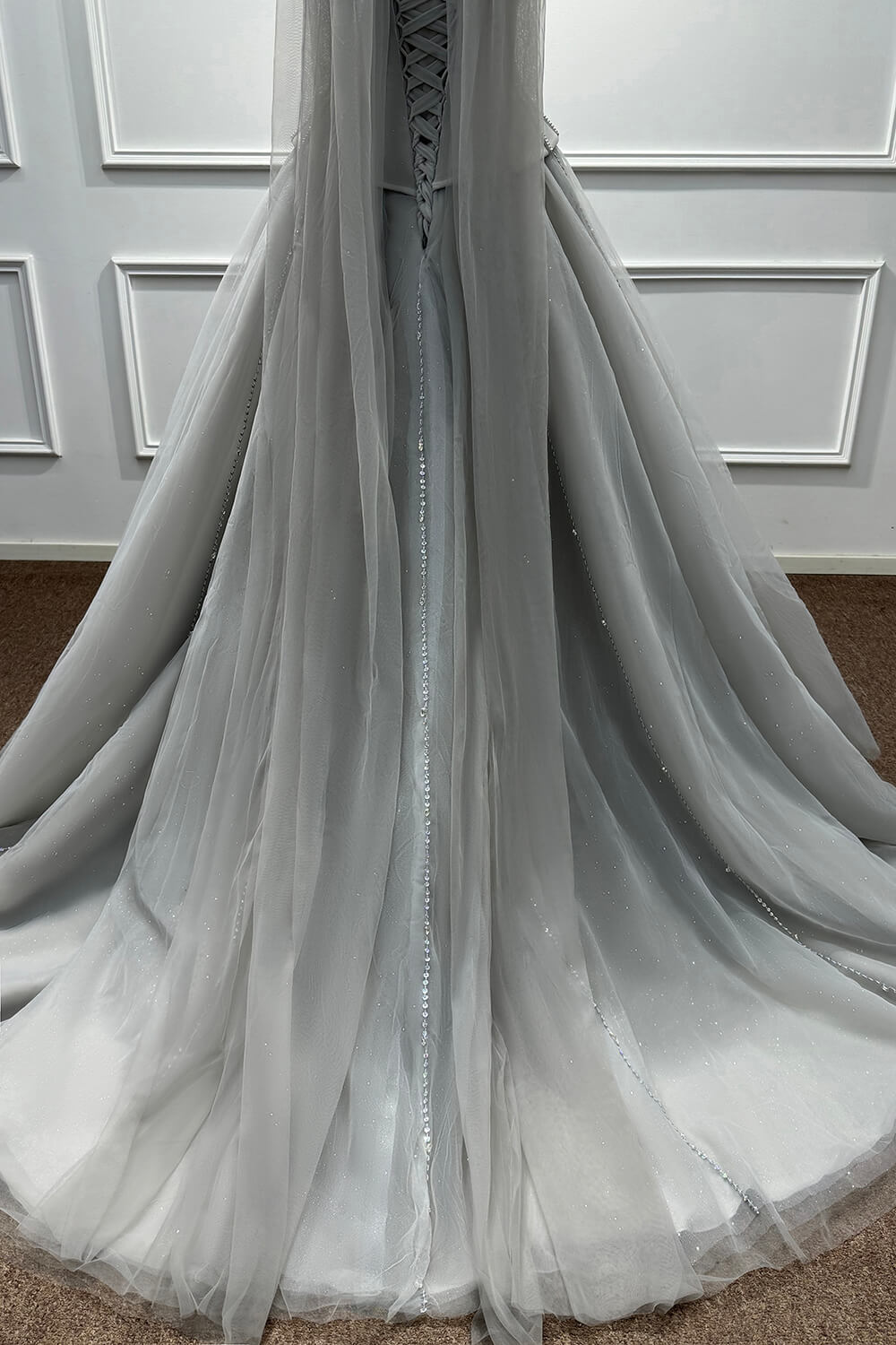 This dress combines timeless elegance with modern sophistication. The corset construction ensures a flattering fit that accentuates your figure, while the soft tulle skirt creates a dreamy, princess-worthy silhouette. The carefully placed beadings and rhinestones add just the right amount of sparkle without overwhelming the refined grey palette.