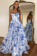 Dreamyannie White Blue Prom Dress Flower Tiered Sweetheart Corset Long Formal Dress